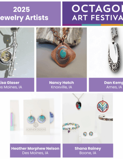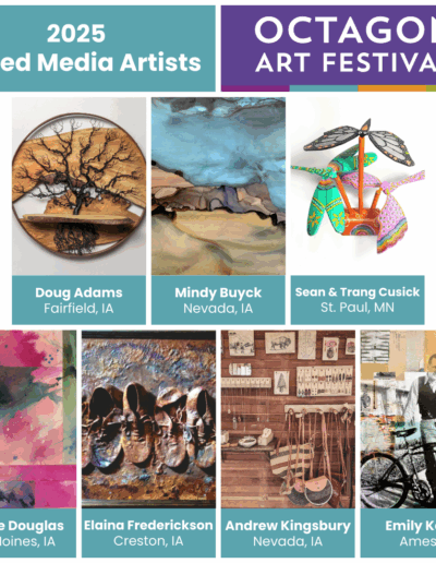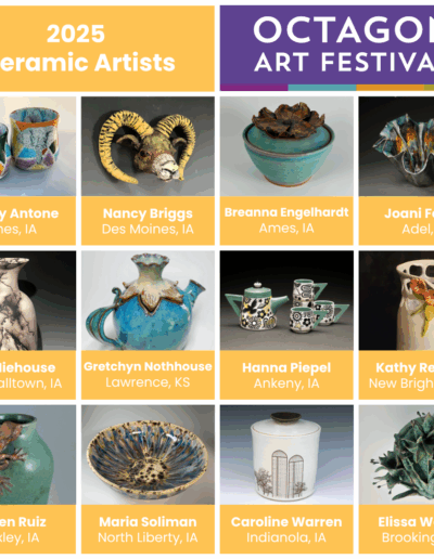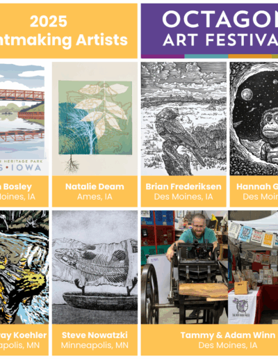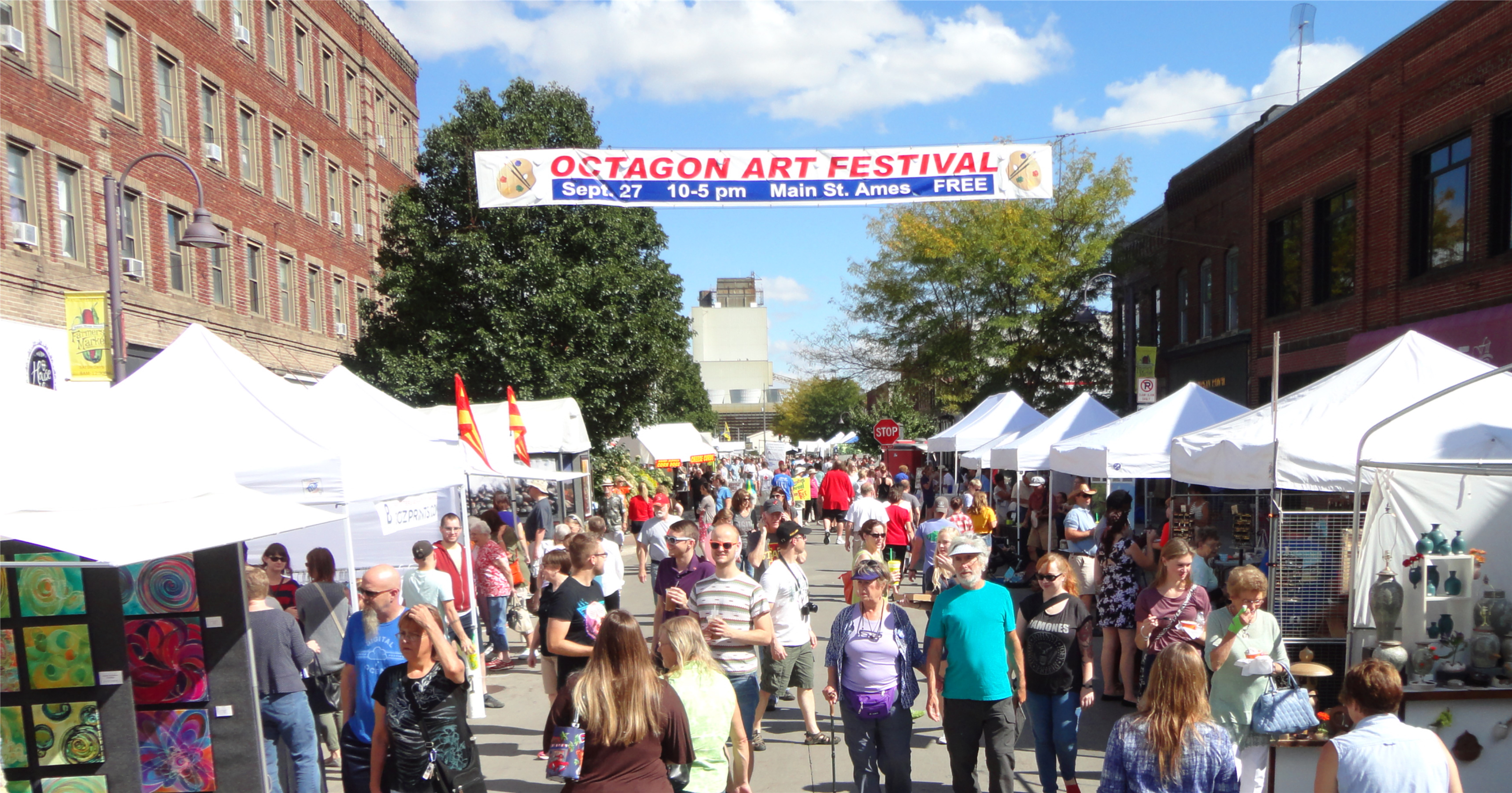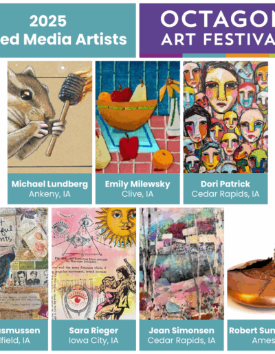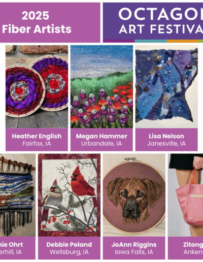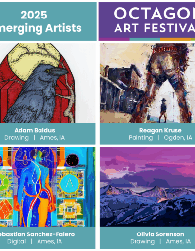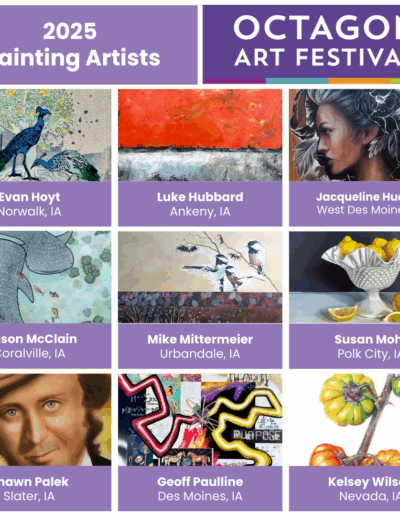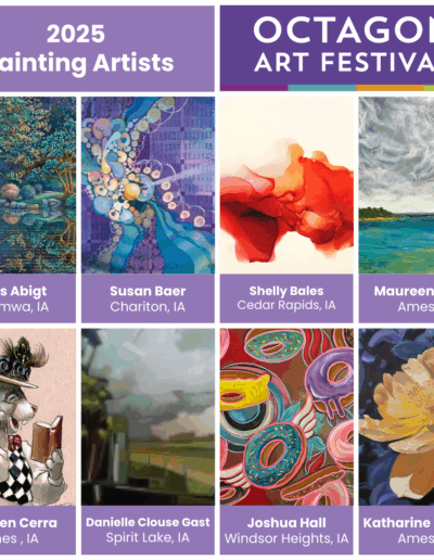 The Octagon Art Festival takes place the fourth Sunday of September along Main Street in downtown Ames, IA. The festival is held outdoors on pavement, RAIN OR SHINE. Visual arts, children’s art area, food vendors and performing arts form the foundation of the Octagon Art Festival. Approximately 10,000 people attend the festival.